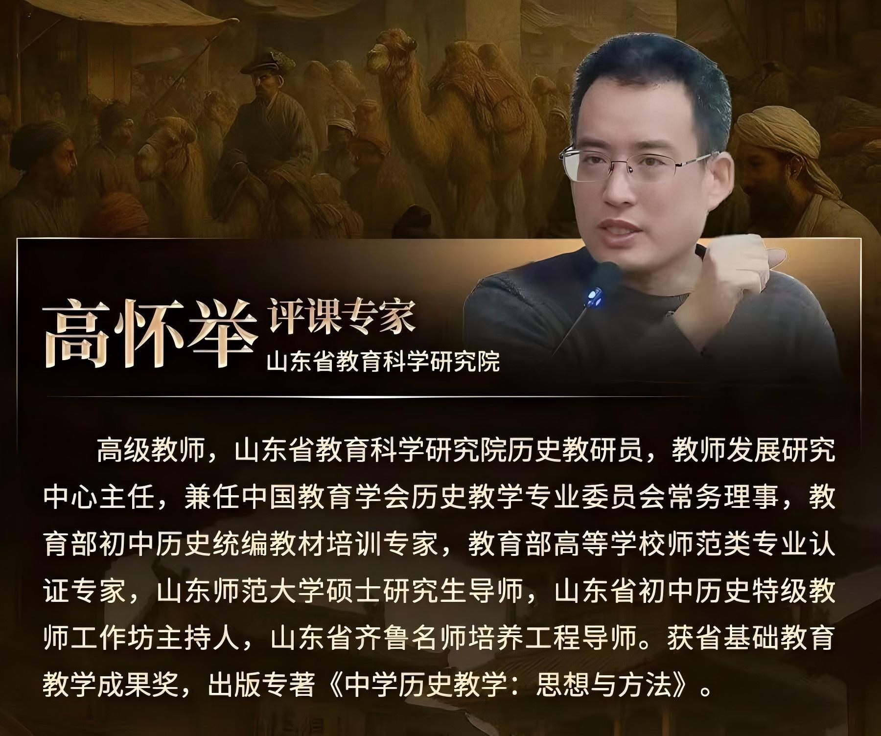 山东省教育科学研究院历史教研员,教师发展研究中心主任、教育部初中历史统编教材培训专家高怀举老师对林老师的课堂给予高度赞誉。他指出,该课程设计独具匠心,深度挖掘教材知识拓展内容,以探秘 “南海一号”为线索,巧妙串联课本各子目,构建起完整的教学情境。这种创新方式将原本抽象枯燥的教材内容变得生动有趣、具体可感,极大提升了教材的使用效能。此外,林老师在教学素材选用上眼光独到,不仅精准落实教学目标,还进一步拓宽了学生的认知边界。高怀举老师结合自身丰富的实践经验,着重强调在中外交流史的教学过程中,不仅要关注空间维度上中外之间的联系,以及社会各要素的相互影响,更要注重时间维度上的思维贯通,以此达到 “通古今之变” 的教学效果,实现知识的结构化整合。