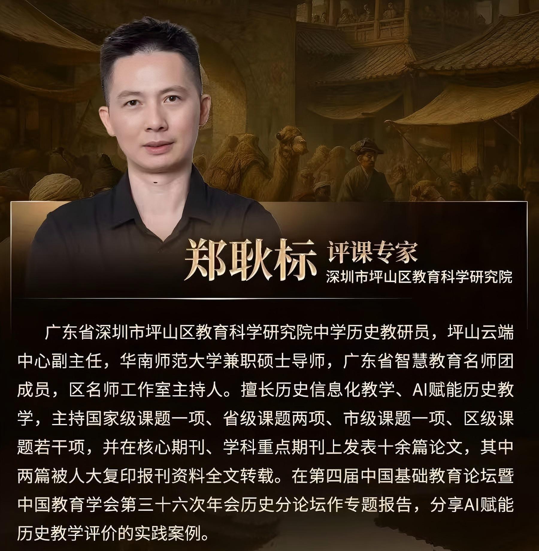 广东省深圳市坪山区教育科学研究院中学历史教研员、坪山云端中心副主任、广东省智慧教育名师团成员郑耿标老师对本节课给予高度肯定,认为其充分彰显了基于核心素养导向的创新教学理念,生动展现了粤派名师的 “问・学”课堂模式,无论是教学设计的精巧构思,还是课堂实施的流畅推进,都深度融合鲜明的时代特征与深厚的历史学科内涵。郑老师着重围绕技术赋能课堂与 “问・学”课堂实施两大核心维度展开深入分析。他指出,林老师巧妙借助智能技术,构建起全方位、多层次的学习情境,让学生仿若置身历史现场,极大增强了学习的代入感与沉浸感;课后布置的创新作业,更架起历史与现实的桥梁,实现知识从课堂到生活的迁移应用。技术的深度融入,不仅助力教师实时精准把握学情,有效激发学生学习热情,还在日常教学中悄然提升学生的信息素养。谈及 “问・学”课堂的落实,郑老师着重称赞林老师设计的问题链。该问题链紧密贴合学生 “观察-分析-迁移”的思维逻辑,层层递进、环环相扣,有力培养学生综合分析问题的能力。针对 “问・学”课堂的情境性建构,郑老师提出,应着重保障情境的真实性与完整性,清晰界定教师引导者与学生探究者的角色定位,从而推动课堂中“问・学”过程自然发生、水到渠成。